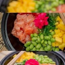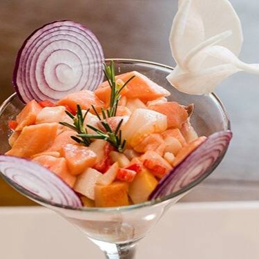 Salmão em cubos,manga em cubos, pimenta biquinho,cebola roxa,cebolinha,flor de sal e suco de limão
