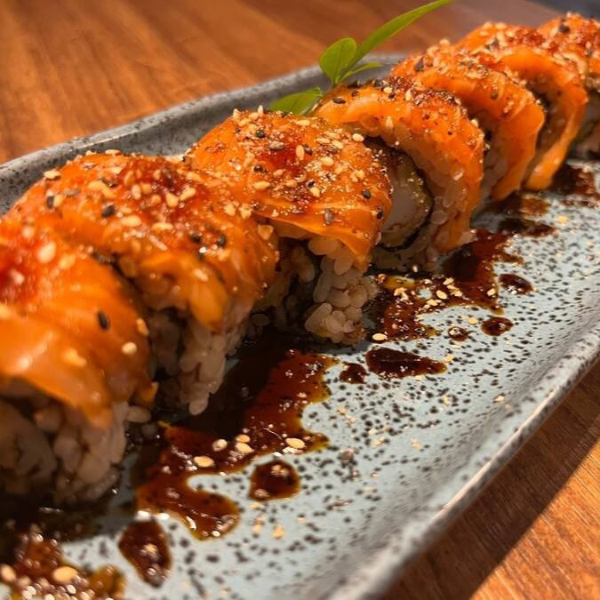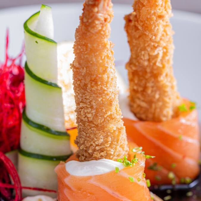 Camarão empanado, limão,cream cheese,envoltos em lâmina de salmão,finalizado com tarê e gergelim