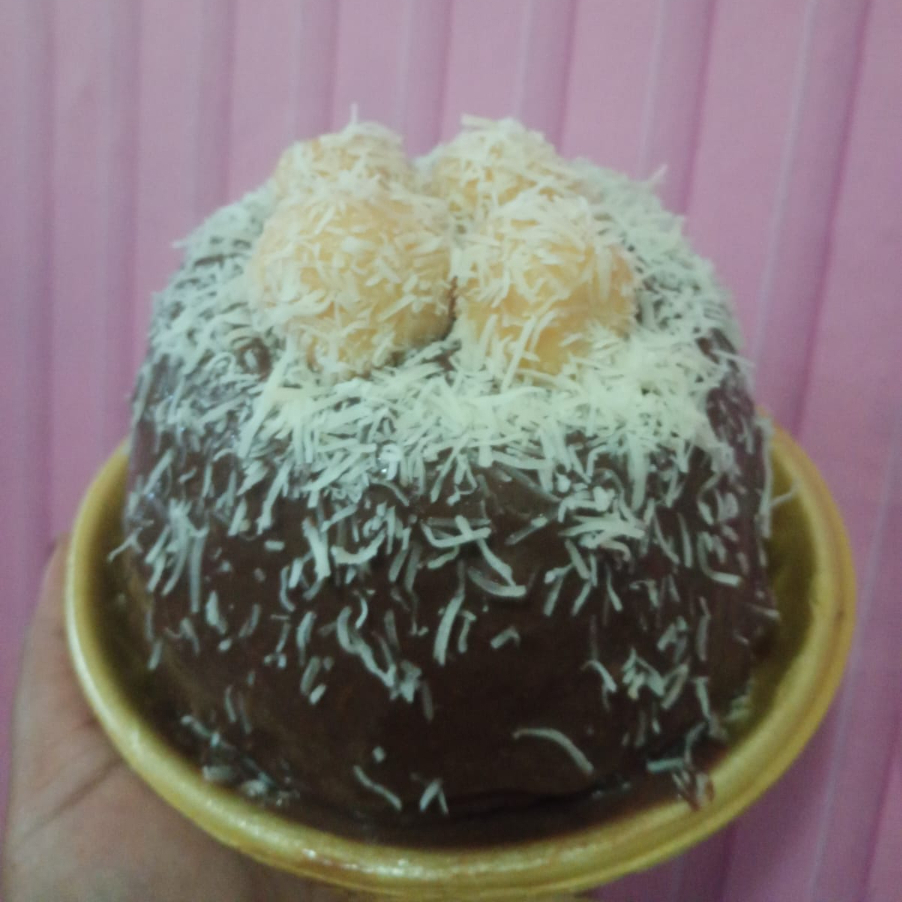 Bolo vulcão preparado com recheio cremoso de ninho e brigadeiro de chocolate 50%.