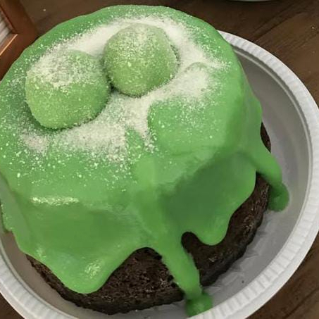 Bolo vulcão com massa de chocolate ou baunilha fofinho, com brigadeiro de pistache e finalizado com morango para decorar.