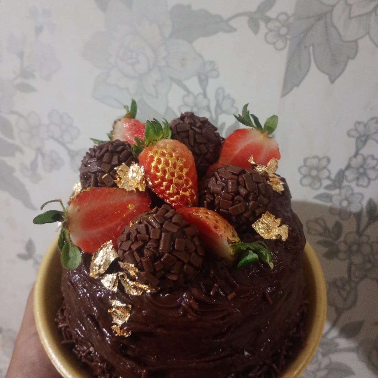 Bolo de chocolate, recheado com brigadeiro de chocolate 50% decorado com morango, brigadeiro tradicional e com folhas de ouro para dar um charme especial.