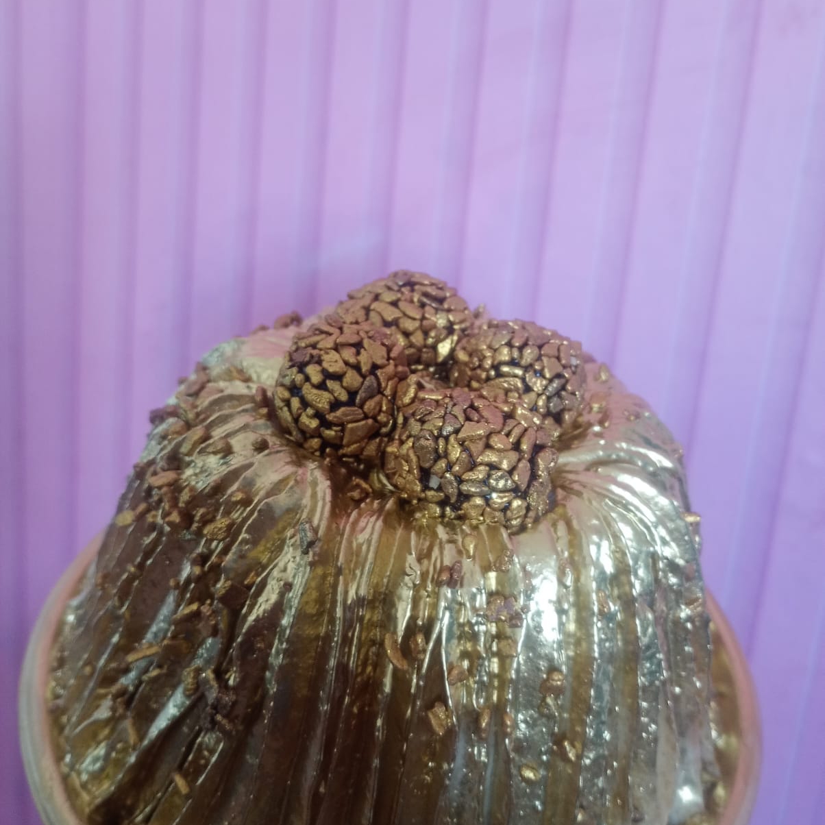 Bolo com massa de chocolate ou baunilha com brigadeiro de chocolate 50% e brigadeiro de ninho finalizado com brigadeiro tradicional e granulado dourado..