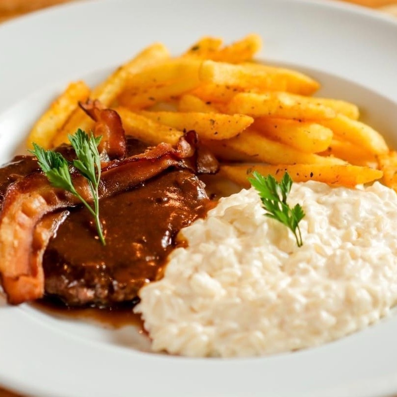 Nosso blend da casa 150g suculento, finalizado com molho pardo de bacon e fatias crocantes de bacon. Servido com arroz cremoso, batatas fritas crocantes e temperadas com o toque especial da casa.