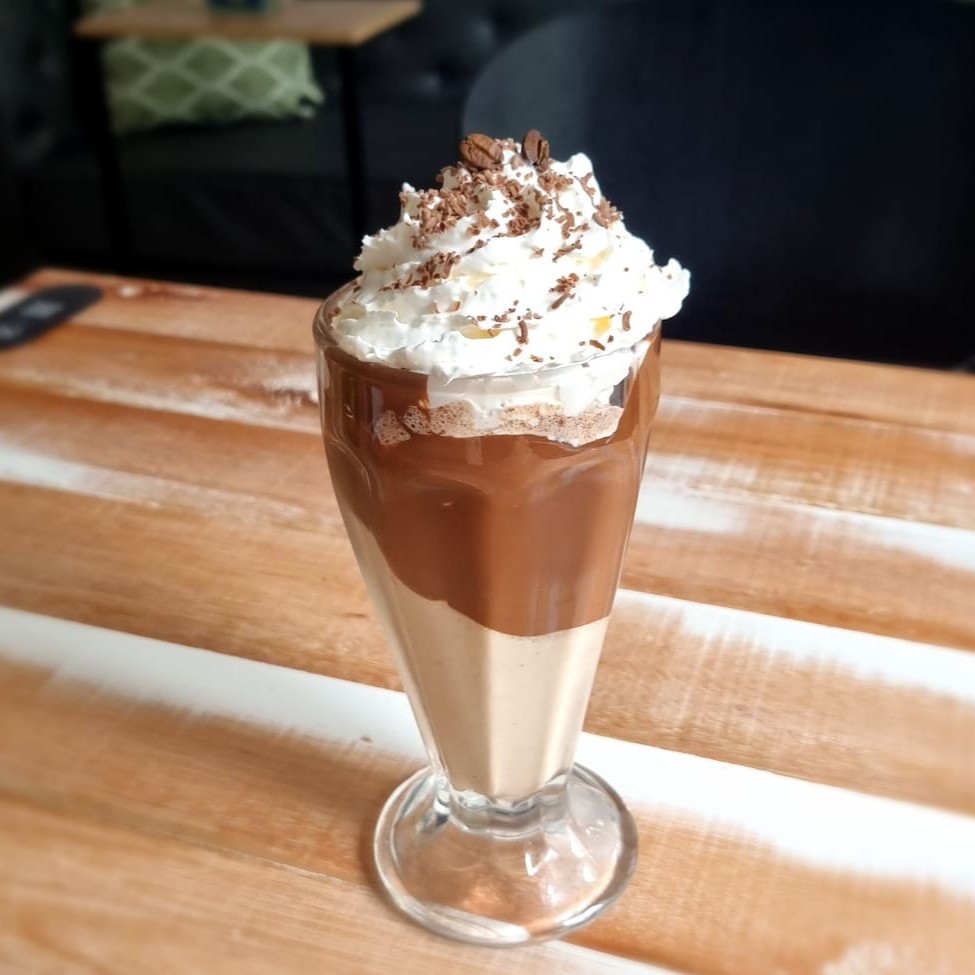 Nosso delicioso e refrescante sorvete de baunilha acompanhado de leite, espresso single, finalizado com ganache de chocolate, chantilly e raspas de chocolate ao leite - 400 ml