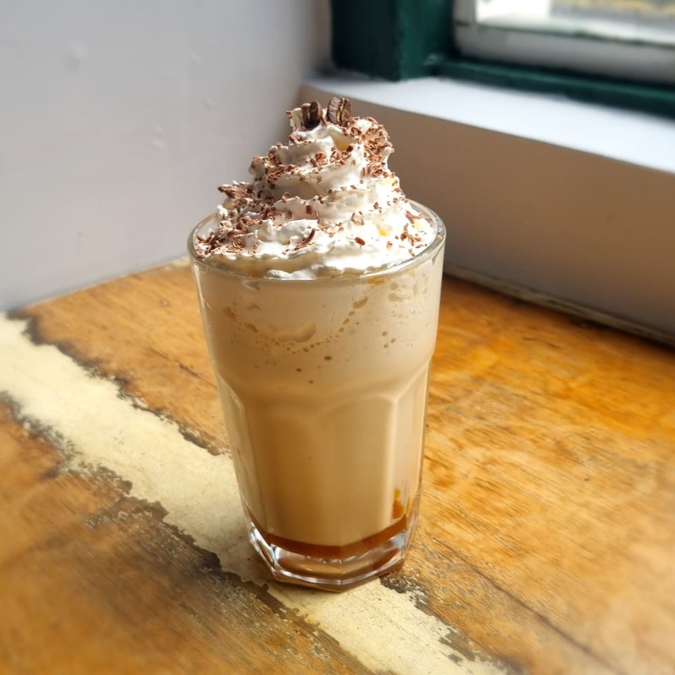 Espresso single, leite gelado e xarope de caramelo batido juntos, base com calda de caramelo e finalizado com nosso saboroso chantilly - 420ml