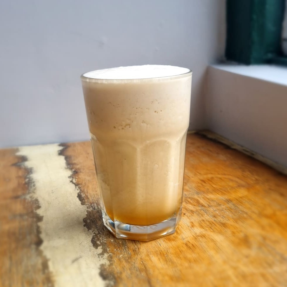 Extrato de xarope natural de massala chai, servido com leite vaporizado e canela polvilhada.