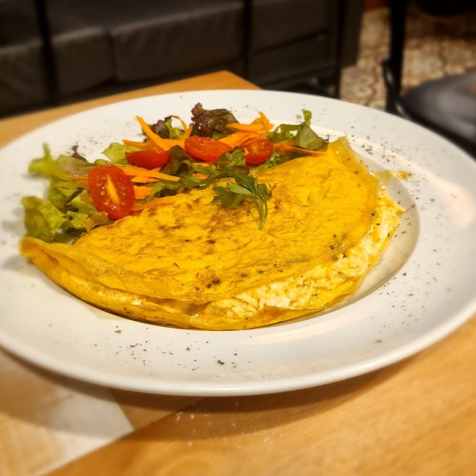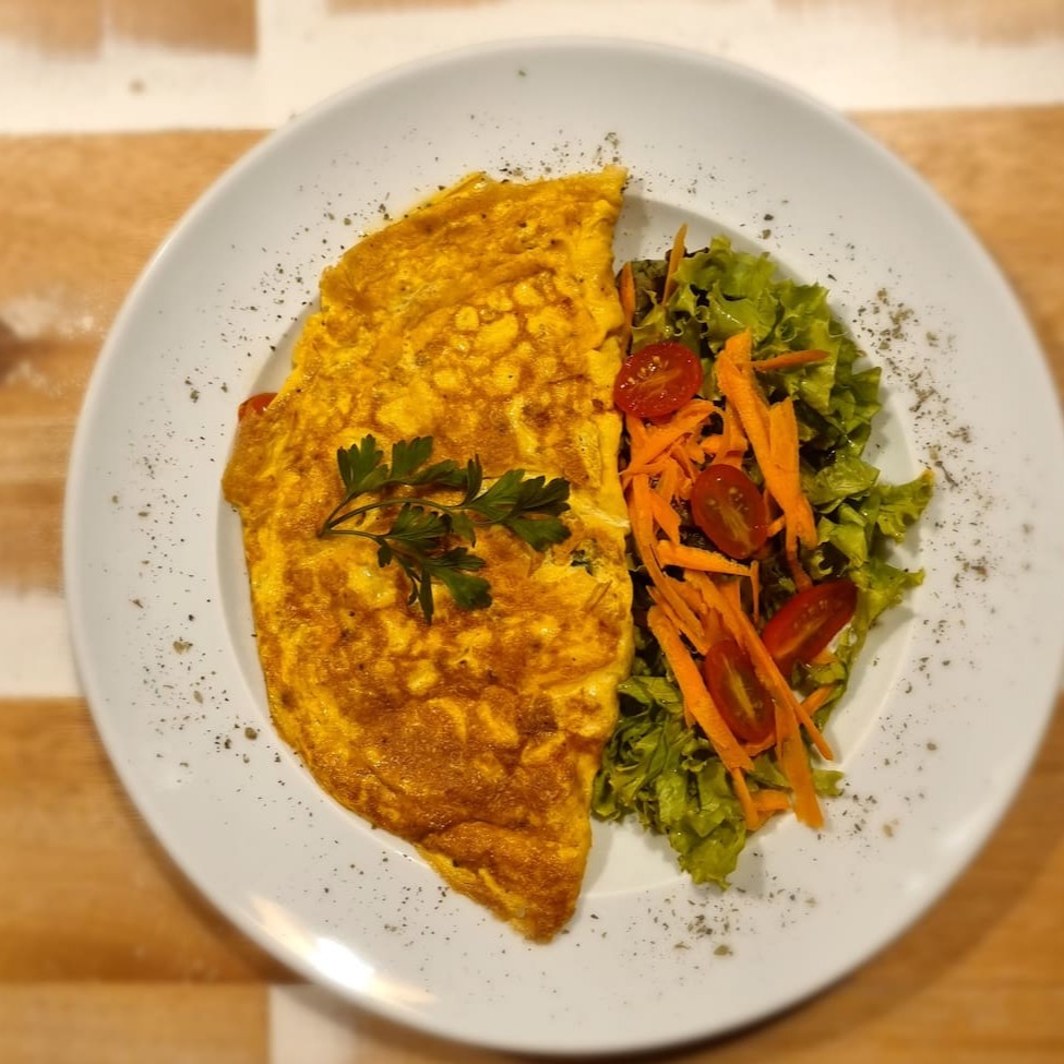 Ovos batidos com queijo muçarela recheado com tomates cereja e manjericão, acompanhado da nossa salada de folhas.