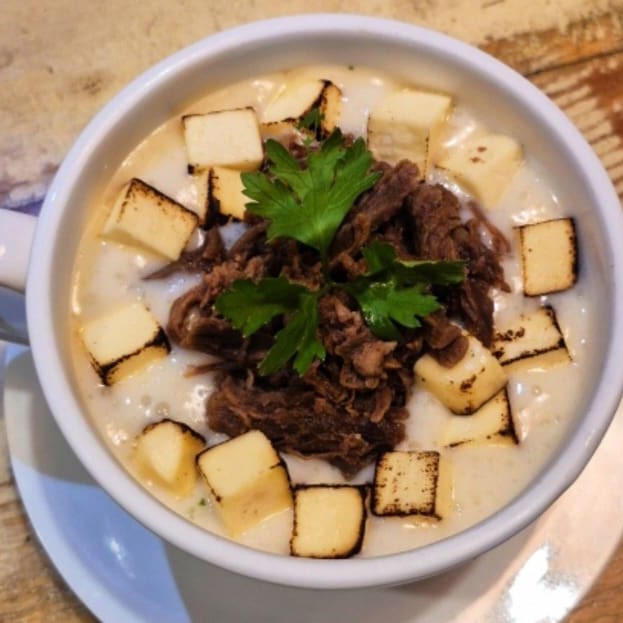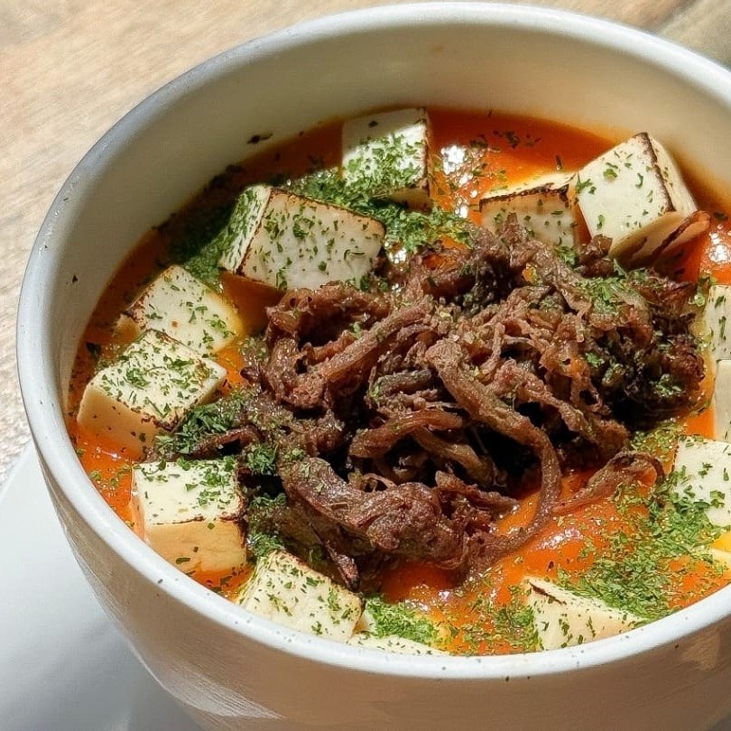 Creme de macaxeira com carne seca desfiada, cubos de queijo coalho maçaricado e torradas crocantes. Serve aproximadamente 350 ml