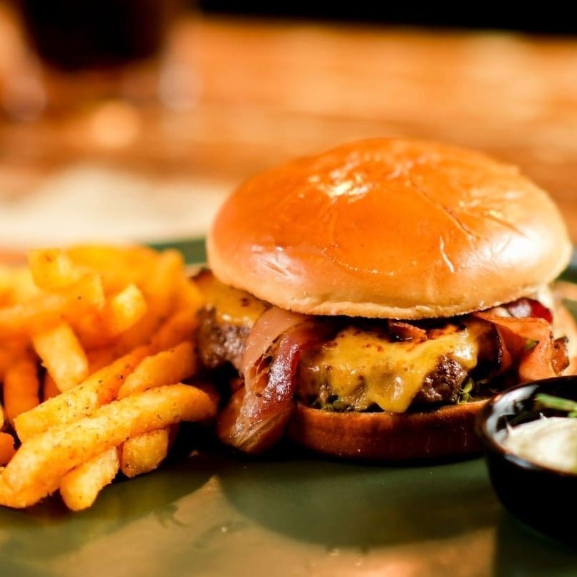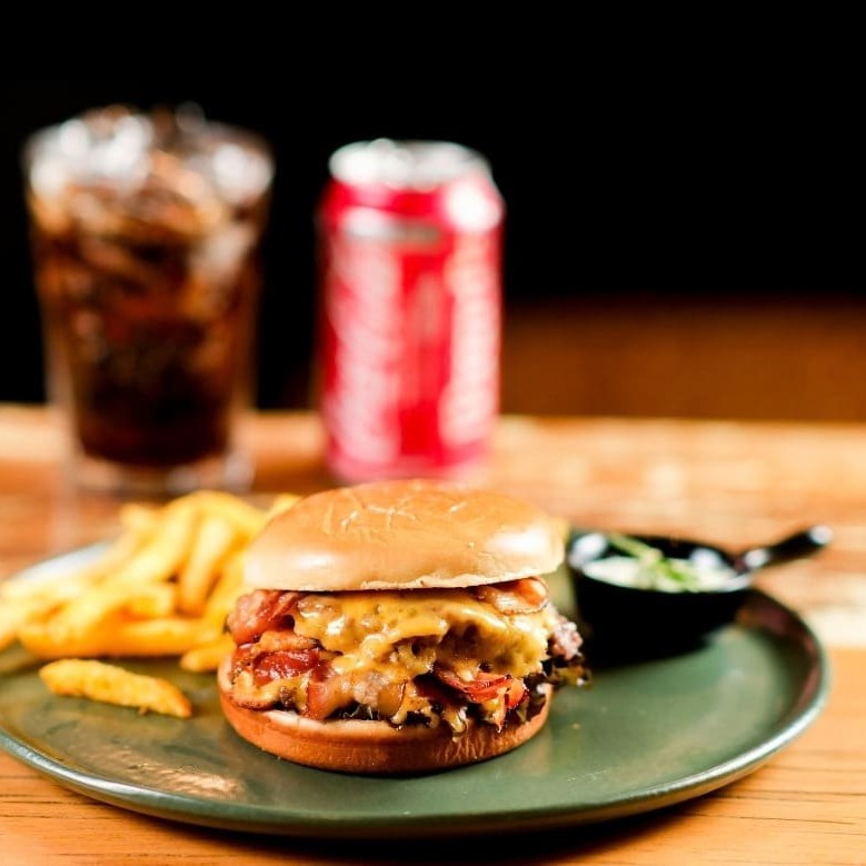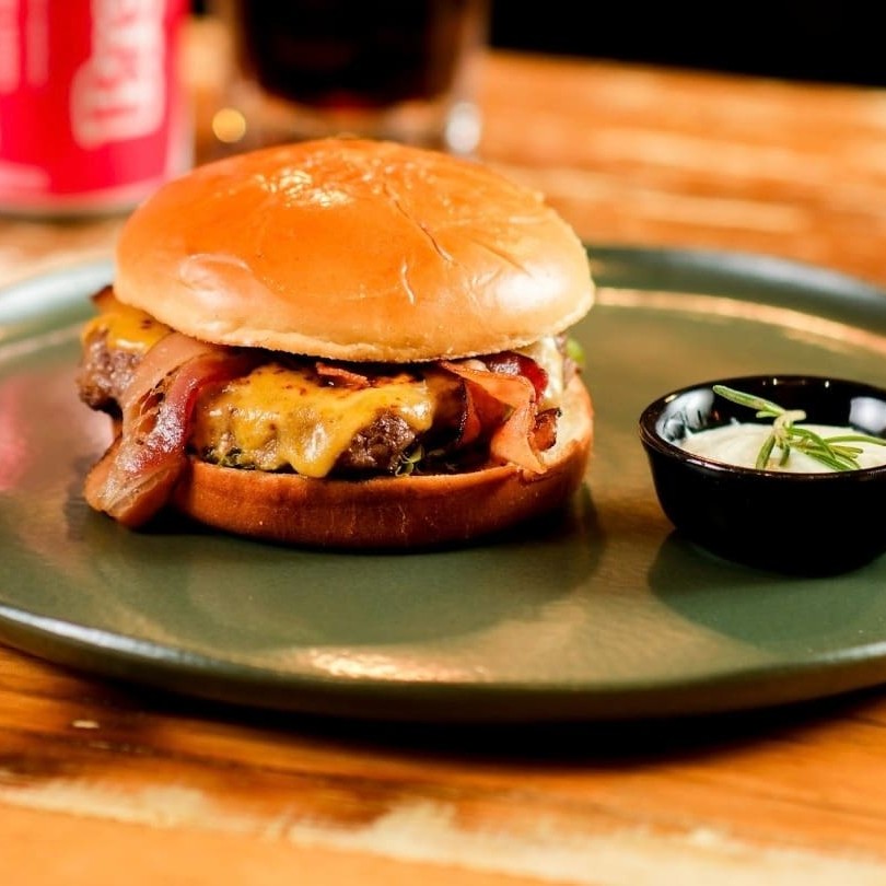 Pão brioche, nosso duplo blend bovino de 80g cada, queijo prato maçaricado, finalizado com ketchup da casa, bacon crocante e salado.