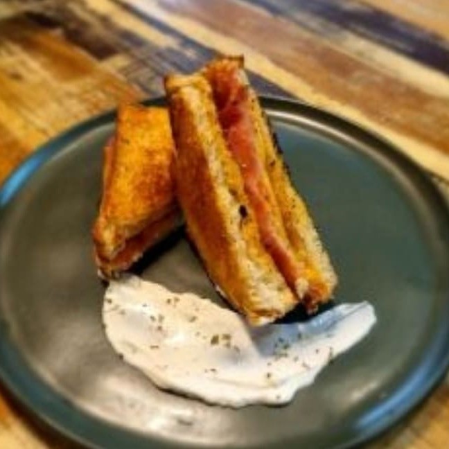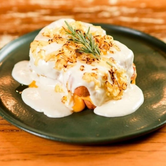 Fofinho e saboroso pão de forma brioche, recheado com queijo muçarela e presunto, coberto com creme branco, finalizado com mais queijo e maçaricado.