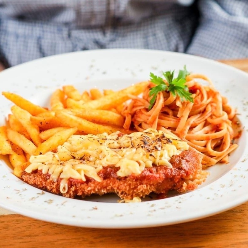 Filé de frango empanado e crocante 200g, coberto com molho e muçarela maçaricada, acompanhado com batatas fritas e massa bavette gran duro.