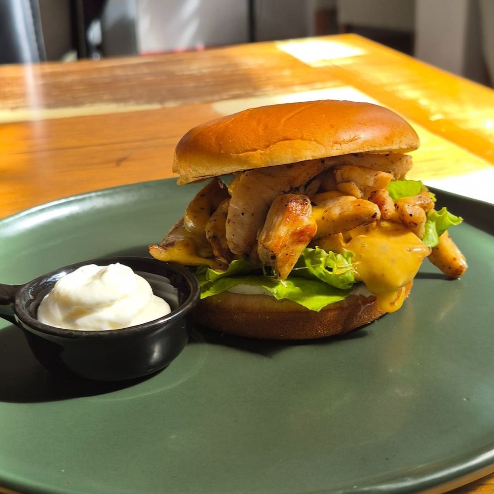 Pão brioche, frango chapeado no azeite e pimenta do reino, finalizado com queijo prato maçaricado e molho caeser.