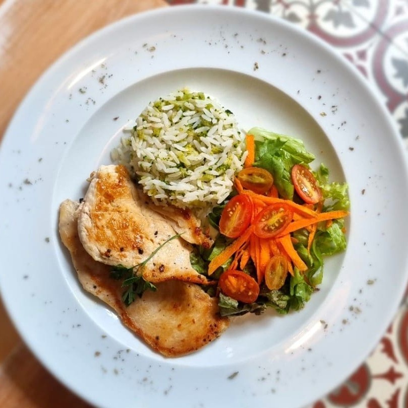 Suculento filé de peito de frango assado 200g, acomapnha de arroz com brócolis e salada de folhas. consulte as opções de molhos com os nossos atendentes.