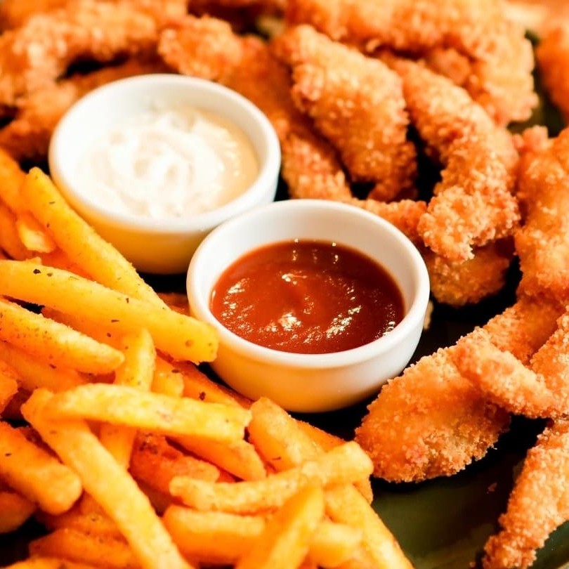 Tiras de frango empanadas na farinha panko, acompanhadas de batata palito temperada com o delicioso sal da casa, ketchup, molho caesar da casa.