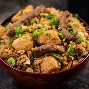 Carne, camarão, pimentão, cebola, risoto (Arroz, presunto, cenoura, cebolinho e ovo) e molho.