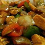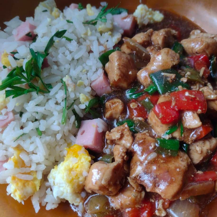 Frango, cebola, pimentão, risoto (presunto, cenoura, cebolinho e ovo) e molho.