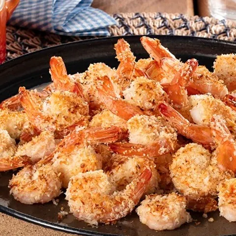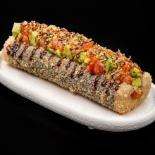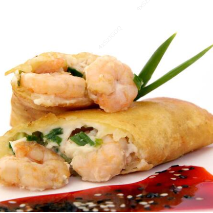 Frango, camarão, cebola, pimentão, risoto (presunto, cenoura, cebolinho e ovo) e molho.
