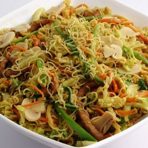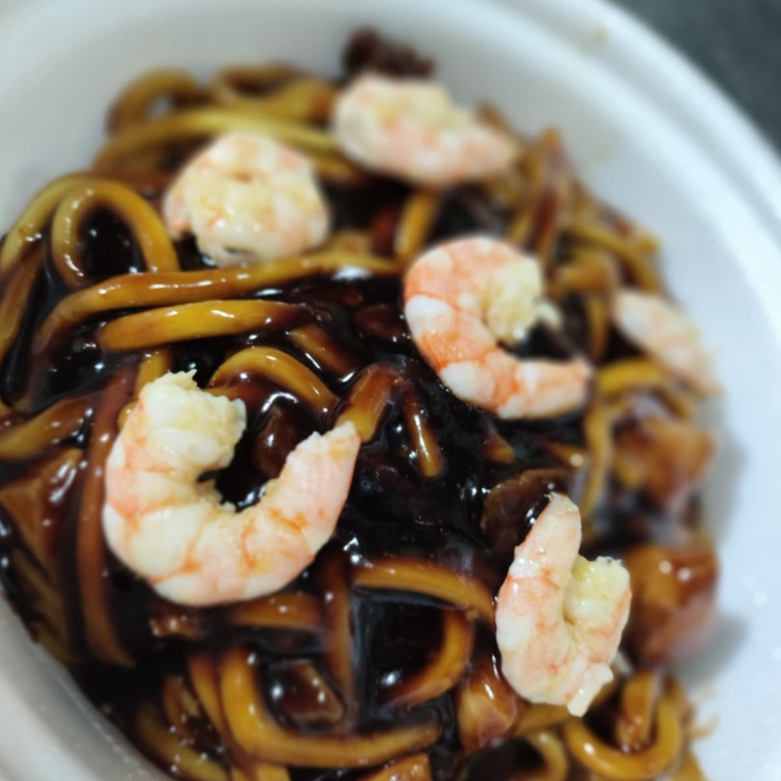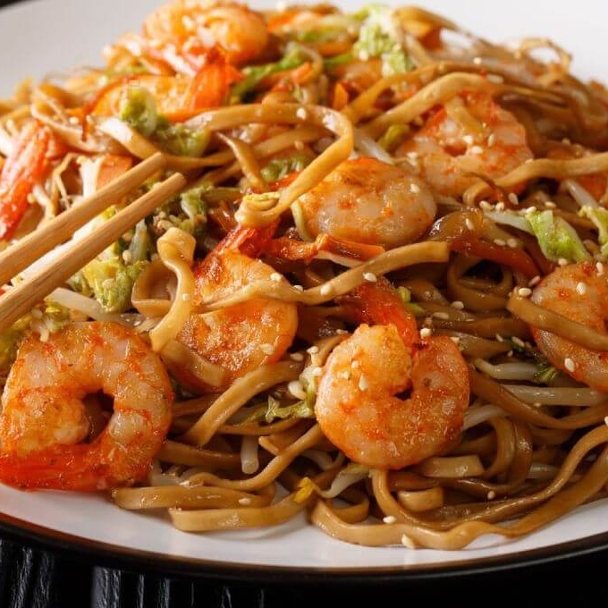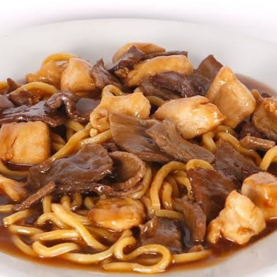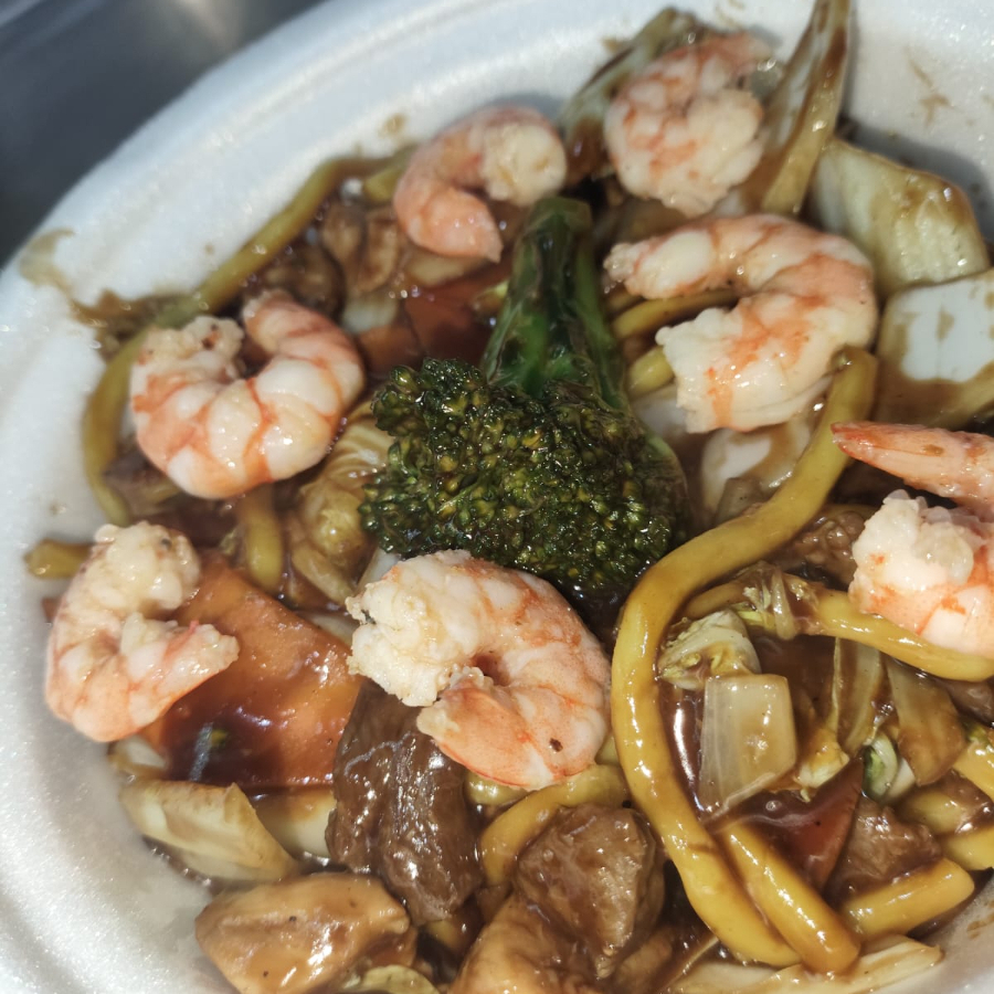 Macarrão chinês, camarão, carne, frango, acelga, cenoura, cebola e pimentão.