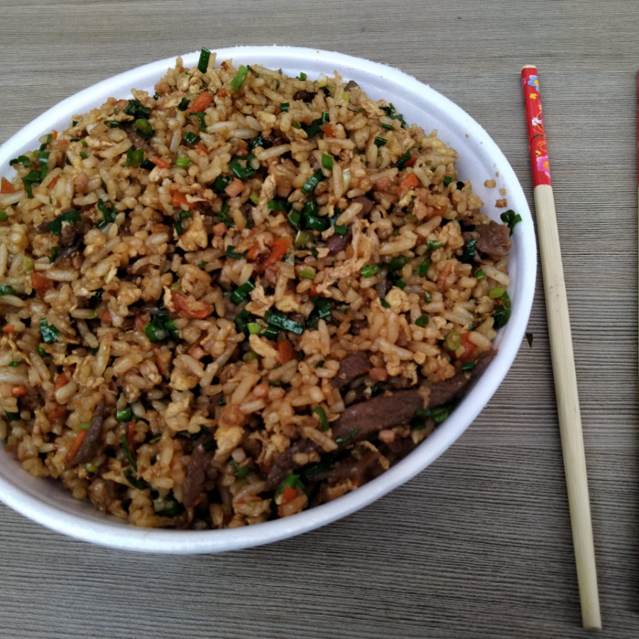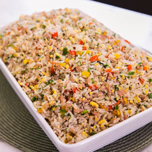 Arroz, cebolinha, carne, presunto, cenoura, ovos