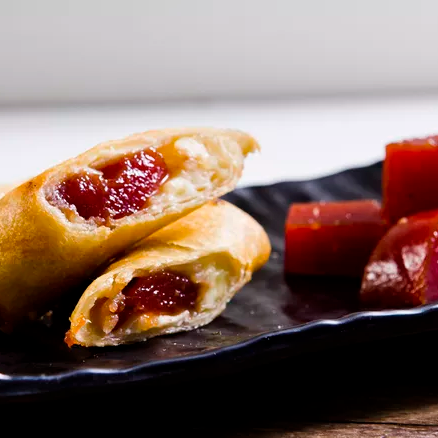 Massa de rolinho, queijo, goiabada, açúcar e canela