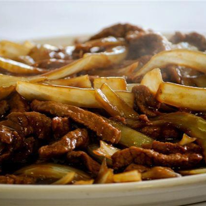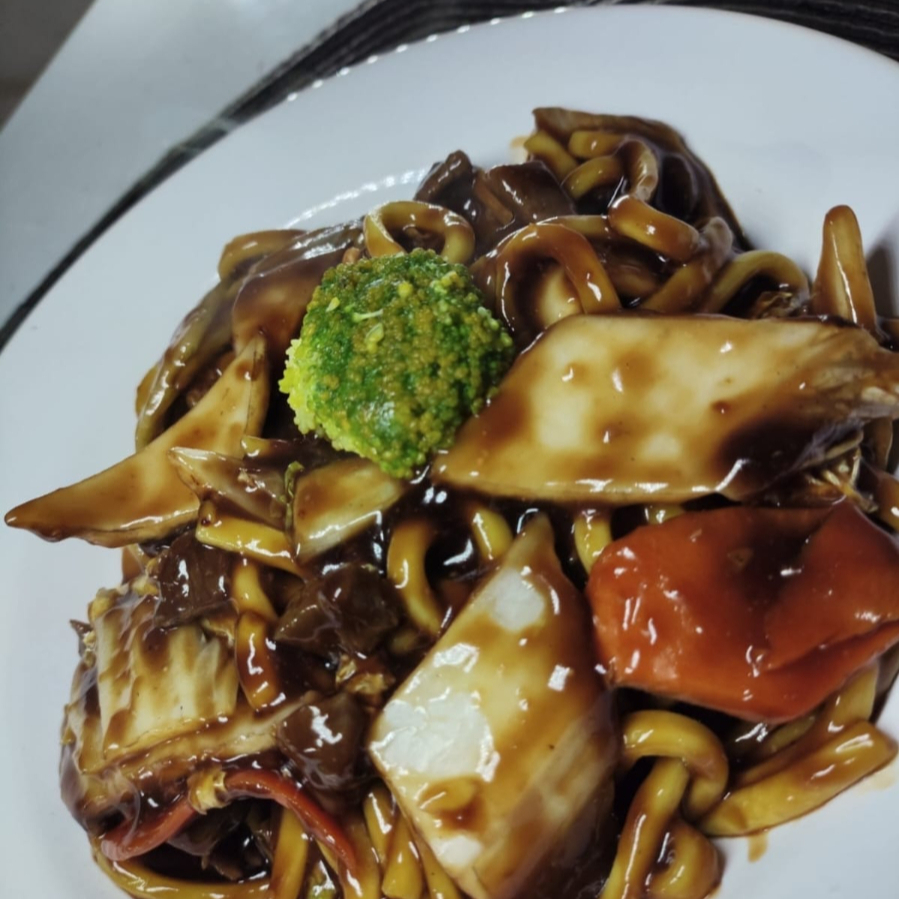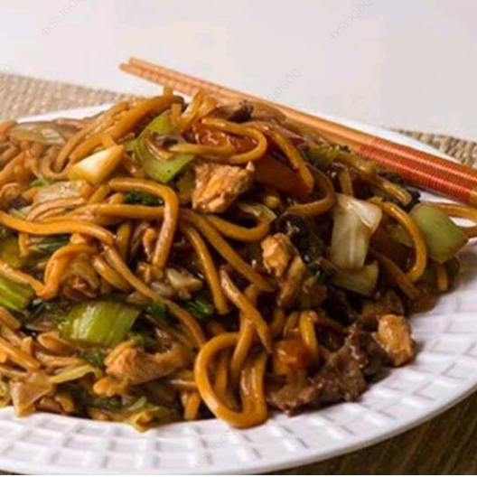Macarrão chinês, carne, frango, acelga, cenoura, cebola e pimentão.