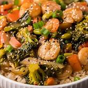 Arroz, cebolinha, carne, frango. camarão, presunto, cenoura e ovos