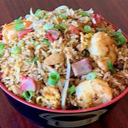 Arroz, cebolinha ,camarão, presunto, cenoura e ovos.
