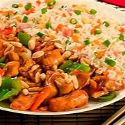 Frango, camarão, cebola, pimentão, risoto (presunto, cenoura, cebolinho e ovo) e molho,