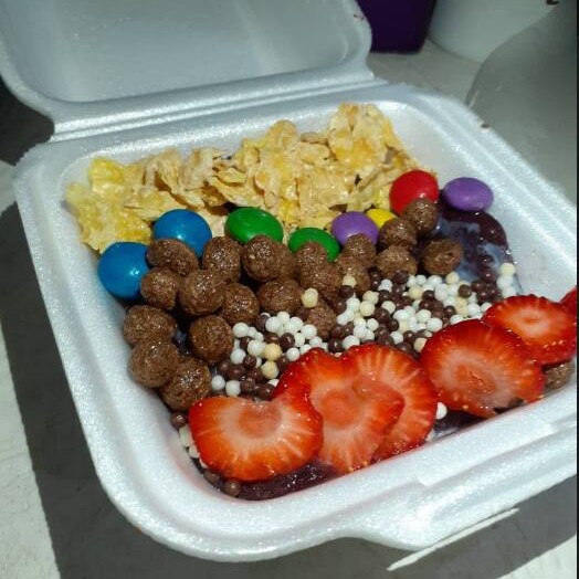 Cobertura: 2 cereais+2 frutas+1 calda+1 adicional simplesrecheio: 2 cereais+1 fruta+1 calda