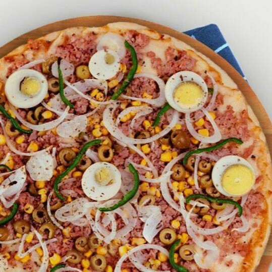 Molho artesanal, muçarela, presunto, ovos, verduras e orégano
