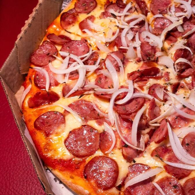 Calabresa com uma deliciosa camada de mussarela, cebola e orégano