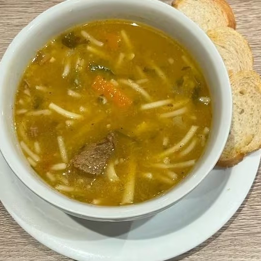 Caldo de carne bem magrinha, com espaguete, legumes e torrada.