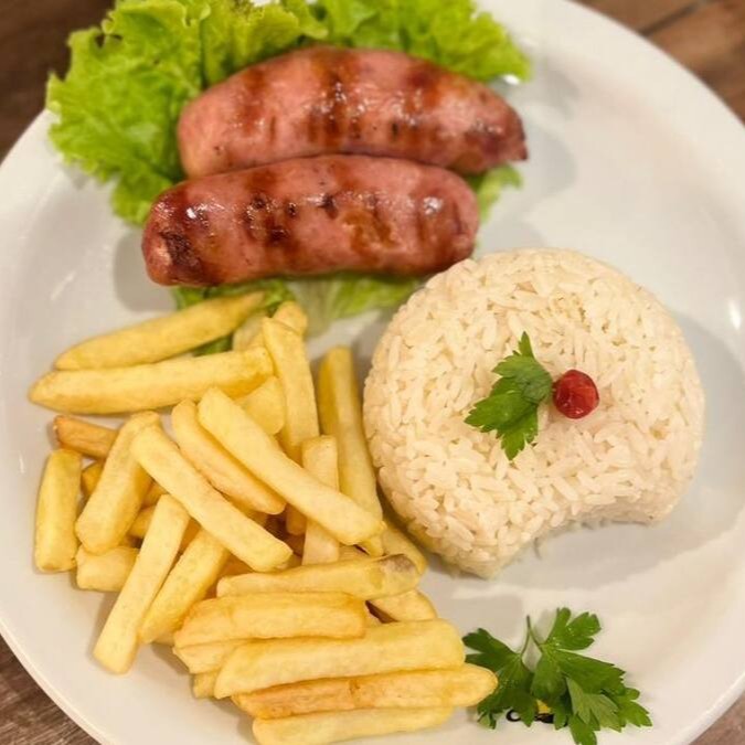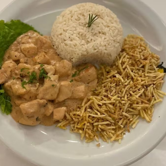 Filé de peito de frango em cubos, com molho cremoso, acompanhado de arroz branco e batata palha crocante.