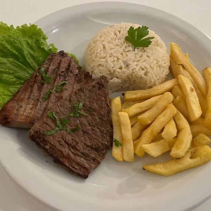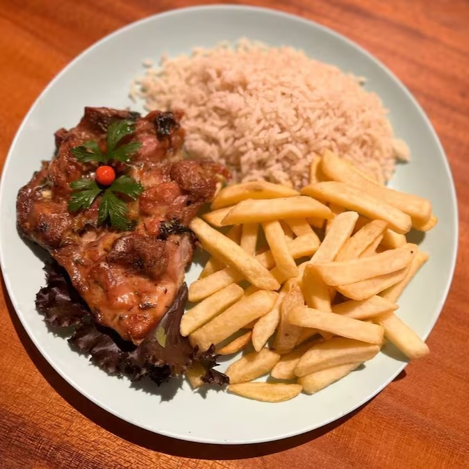 Filé de coxa ou sobre coxa de frango desossado, crocante, assado no forno, acompanha feijão mulato, arroz branco e farofa da casa.