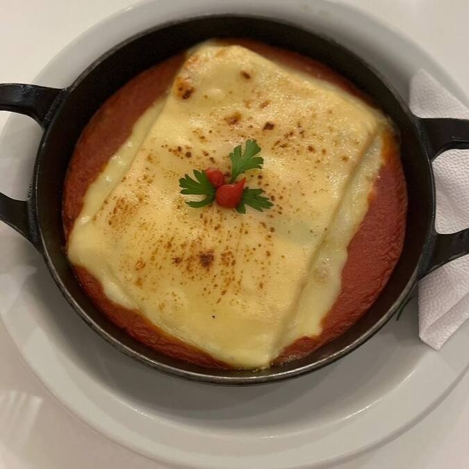Lasanha à bolonhesa, recheada com queijo mussarela e presunto, regada com molho branco e molho de tomate da casa, coberta com mussarela gratinada.