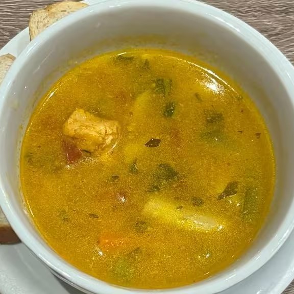 Sopa de filé de peito de frango, com espaguete e legumes, acompanha torradas.