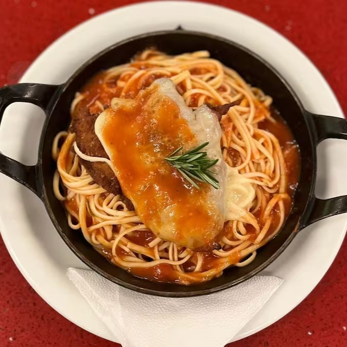 Filé de peito de frango empanado e frito, gratinado com mussarela, regado com molho de tomate da casa e espaguete.