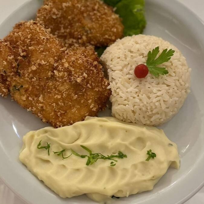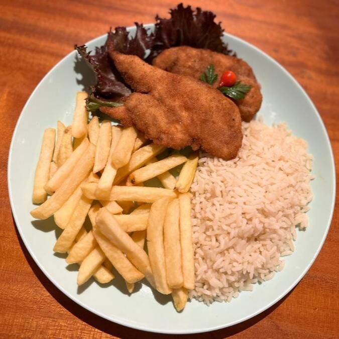 Filé de peito de frango empanado e frito, com 3 acompanhamentos à sua escolha.
