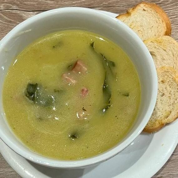 Creme de batata, cenoura, couve, refolgado com bacon, calabresa e cebola, servido com torradas.