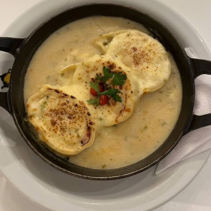 Lâminas de massa enroladas, e cortadas em fatias, recheadas com queijo mussarela e presunto, regadas com molho branco da casa e queijo parmesão ralado.
