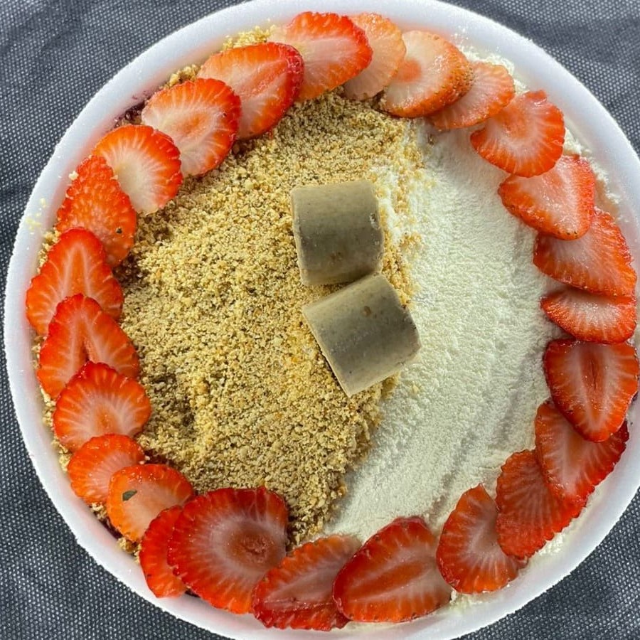 Açaí tradicional cremoso com creme de avelã, acompanhado de 4 adicionais, 2 frutas e 2 caldas