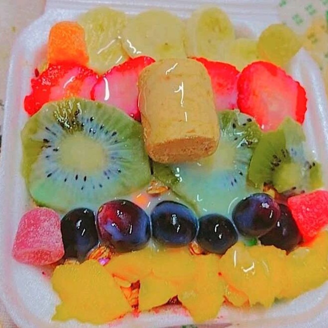 Uma deliciosa barca com tudo completo. Leite em po,granola,paçoca,sucrilhos,chocobaal, jujuba,m&m Frutas: uva, banana,kiwi,manga coberturas leite condensado, morango