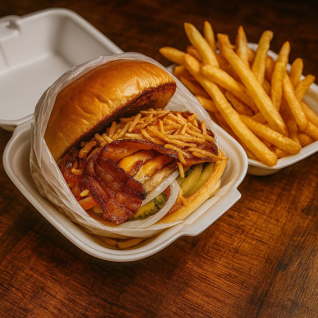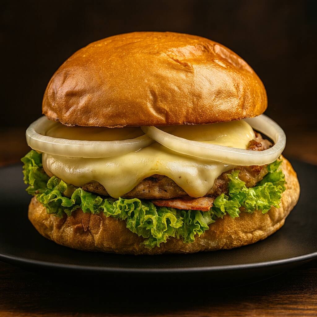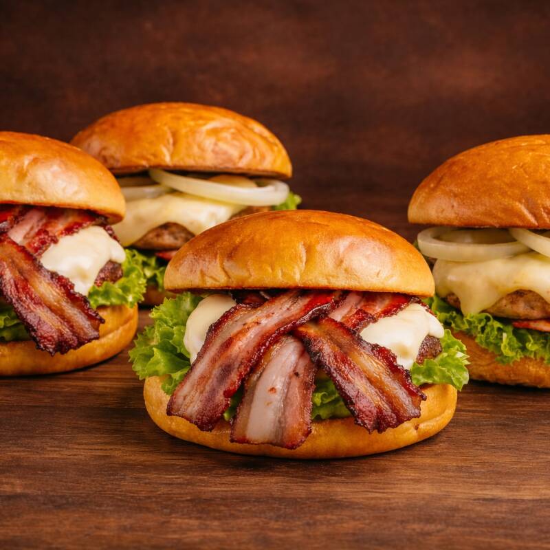 Pão bola, carne industrial 56g, bacon, queijo mussarela, alface, tomate, cebola e maionese caseira.