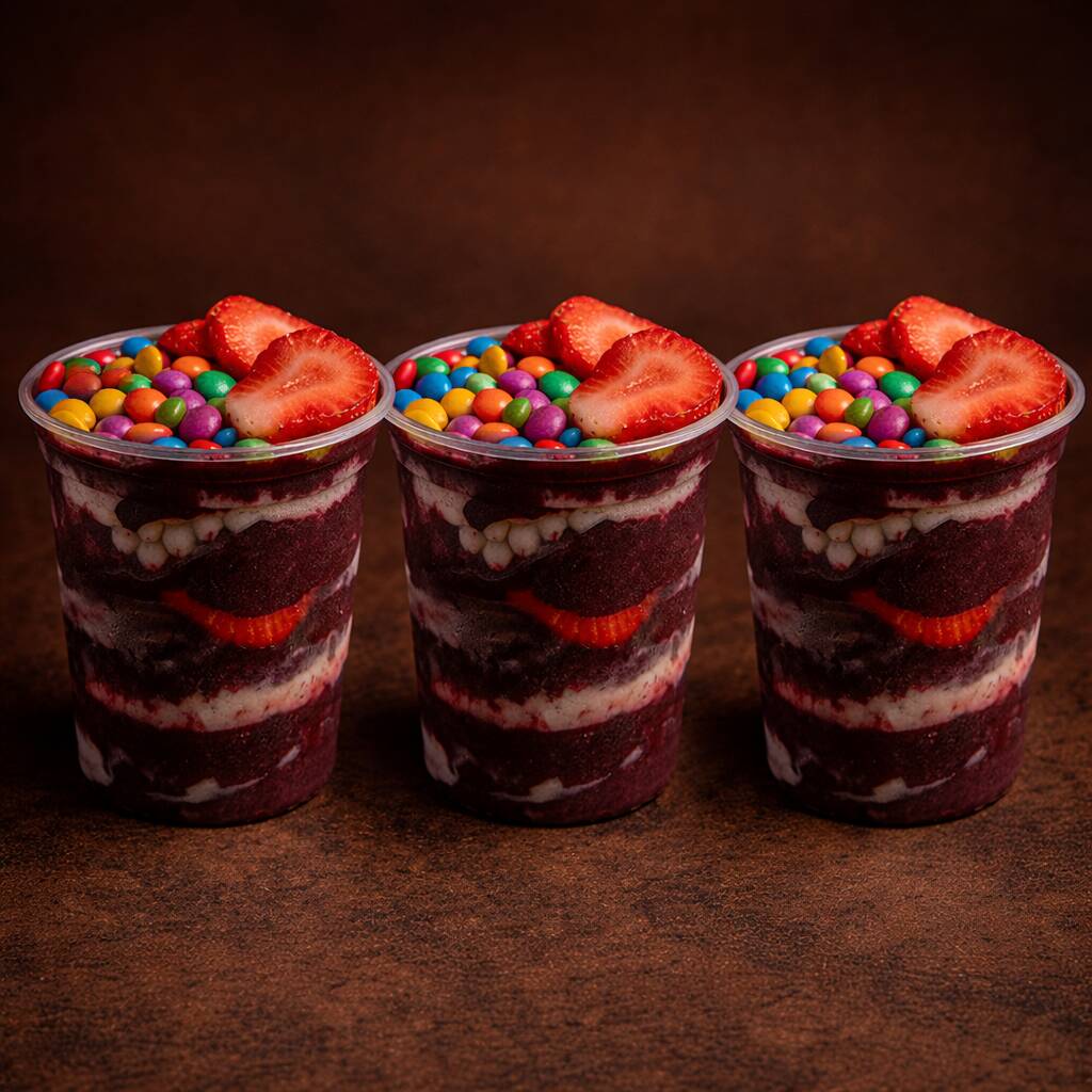 Com direito a 3 adicionais, 2 frutas, 1 Calda