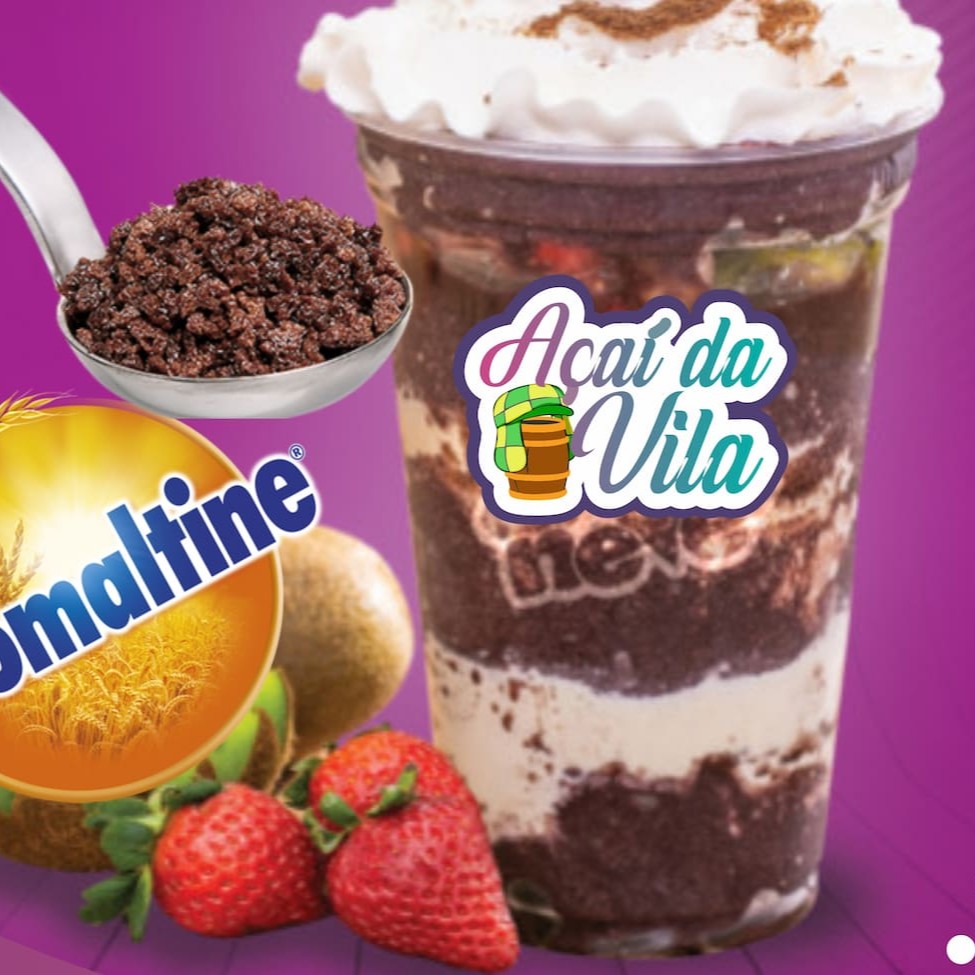 Delicioso açaí com creme de Ovomaltine escolha até 2 acompanhamentos, 2 frutas e 2 caldas.