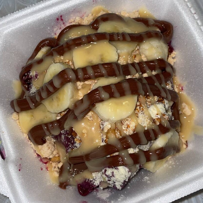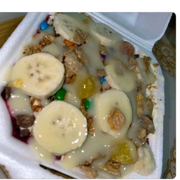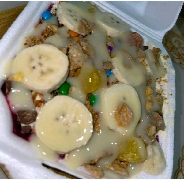 Vem se deliciar com esse saboroso açaí, com seus deliciosos complementos, banana, leite em pó, farinha de paçoca, granola,e leite condensado