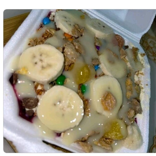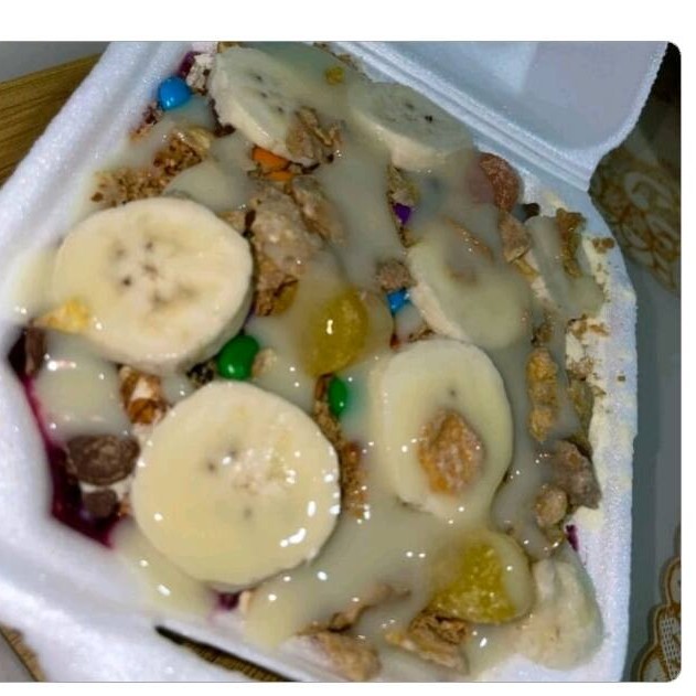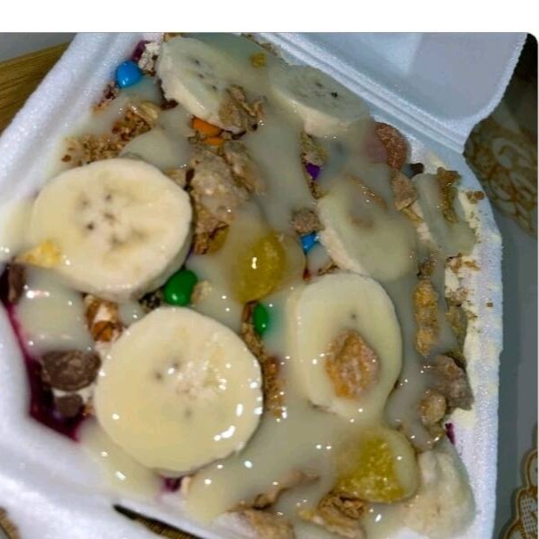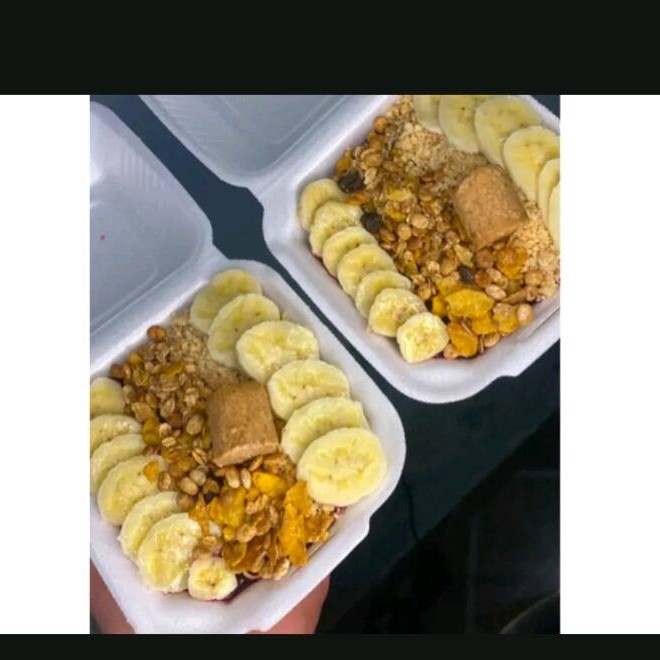 Completos para você saborear, banana, farinha de paçoca, leite em pó,granola, Leite condensado.