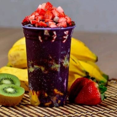 Açaí cremoso tradicional super saboroso com frutas selecionadas naturais cortadas na hora com complementos selecionados crocantes a sua escolha (foto ilustrativa).