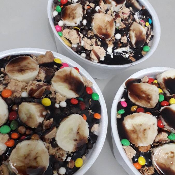 granola, leite em po, farinha de amendoim, paçoca, banana, uva e cobertura OBS: O PRODUTO É VENDIO POR ML