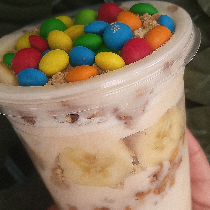 Ingredientes: leite condensado, leite em pó, granola, paçoca, banana e m&m, farinha amendoim.